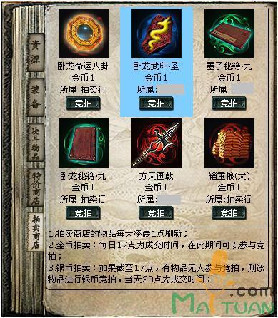游戏商店每日随机抽出6件物品来进行竞拍,不怕你买的不过瘾。不过需要玩家们注意的是,不同的物品起拍价和竞拍加价不同;而同一物品,同一玩家不能连续竞拍哦。每日凌晨1点开始到17点位竞拍时间,截止到17点成交时间,如果有物品没有任何人参与竞拍,那么该物品将会进行银币竞拍哦。若截至20点仍无任何人参与竞拍的物品,则会取消该物品拍卖啦。
