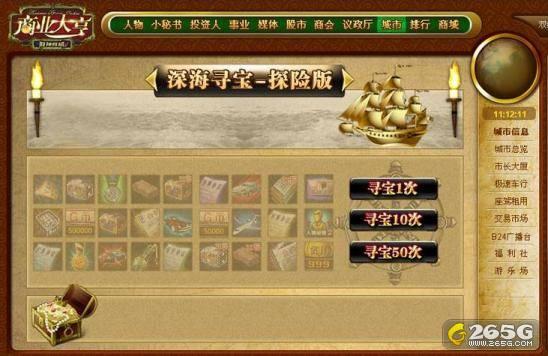 在《商业大亨OL》里,人才的挖掘、培养、竞争与“深海寻宝”都有共同之处,这都是一次富于乐趣的探险旅程。“深海寻宝”功能只需要到商城购买道具,即可获得“寻宝”的机会,你可以利用这次的“寻宝”的机会进行探险旅程,当您的寻宝器数量为零或不足够当前寻宝次数时,系统会自动扣除所需寻宝器的费用;每一次的“宝物”你都有机会获得,也可以赠送给他人使用,这样更能打好自己的商业关系;各种高级的“宝物”都在你面前等待你,千万不可错过!