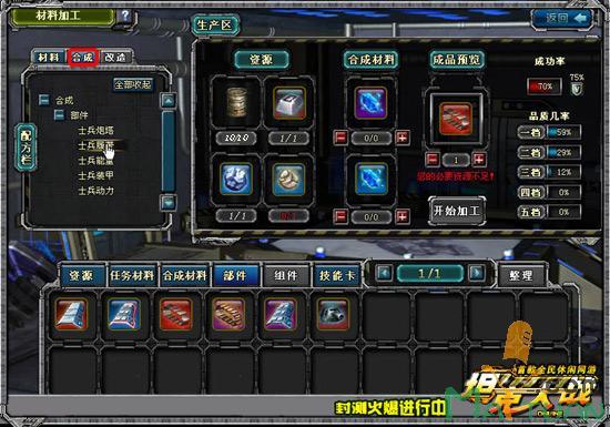 积累了一定的材料,就可以开始合成了。点击“加工厂”中的“加工合成”,或广场中的加工厂,就能进入材料加工的操作界面。如下图所示,点击“合成”框,再点击“士兵履带”或其他部件名称,右边的生产区就会对应显现合成该部件需耗费的材料种类、品质和具体数目。