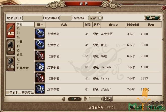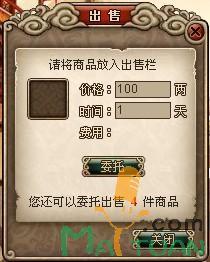 再来看看卖卖东西的出售界面,每天打点小怪,组队杀几只BOSS,怎么也能有些属性不错的装备吧,无耐都是些其他门派的极品,不如放去卜计较那里出售,定好价格,定好时间,说不定一会就有识货的卖家了呢!提醒注意,每个玩家可以同时寄售5件装备哦!