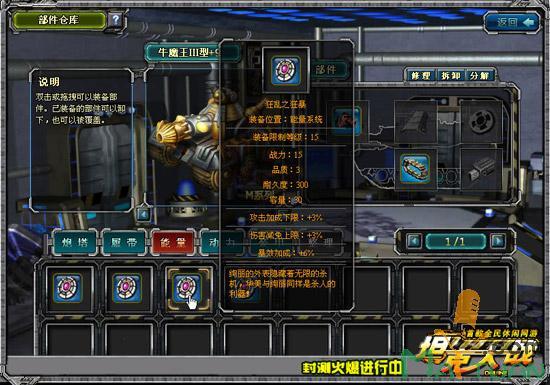 宠物能穿装备,坦克也能穿。坦克穿的装备可不一般,而是由高科技含量的材料合成的部件,装上后能全面提高坦克的属性。合成部件用的材料只需在日常的游戏和任务中即可获得,不花钱也能让你的坦克获得超强能力。