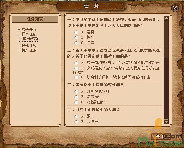 网页游戏《帝国重生》还有与众不同的日常任务,相信在很多大型客户端游戏中都有设置,并且深受玩家喜欢的,那就是“每日问答”!