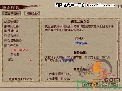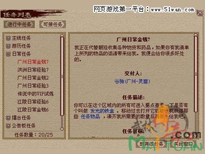 日常任务:每日可以完成一次的常态任务,又分为:经验任务.银两任务和擂台任务,其次接任务的地点大多可以在地图上面找到,一般任务放在村庄只有很少量任务在其他据点,还有就是门派任务是在城市里门派管理员处接受。点及任务NPC头像边的各种标识分别表示不同程度的任务,黄色叹号表示有可接任务、蓝色问号表示有未完成任务、黄色问号表示已完成任务可以找任务NPC交付任务了。
