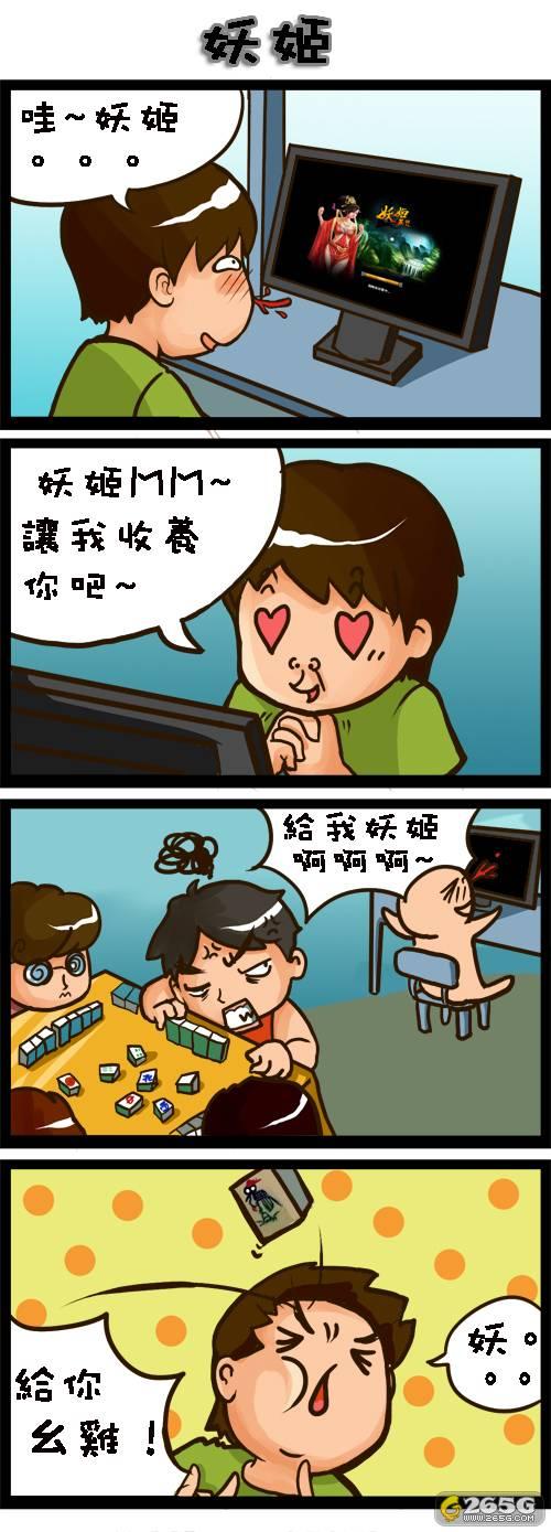 某宅男最近沉迷于妖姬无双之中,因为醉心于妖姬的美艳,故日日夜夜端坐于电脑面前,口念“妖姬”不停,工作吃饭时时刻刻不忘妖姬,某日四方城酣战之时也是神灵附体,大吼一声“给我妖姬吧!”其余三人顿时愕然,其中一人呆呆将刚摸到手中的牌抵到该仁兄面前,怯生生的道:“给你幺鸡吧!”该宅男立刻崩溃!