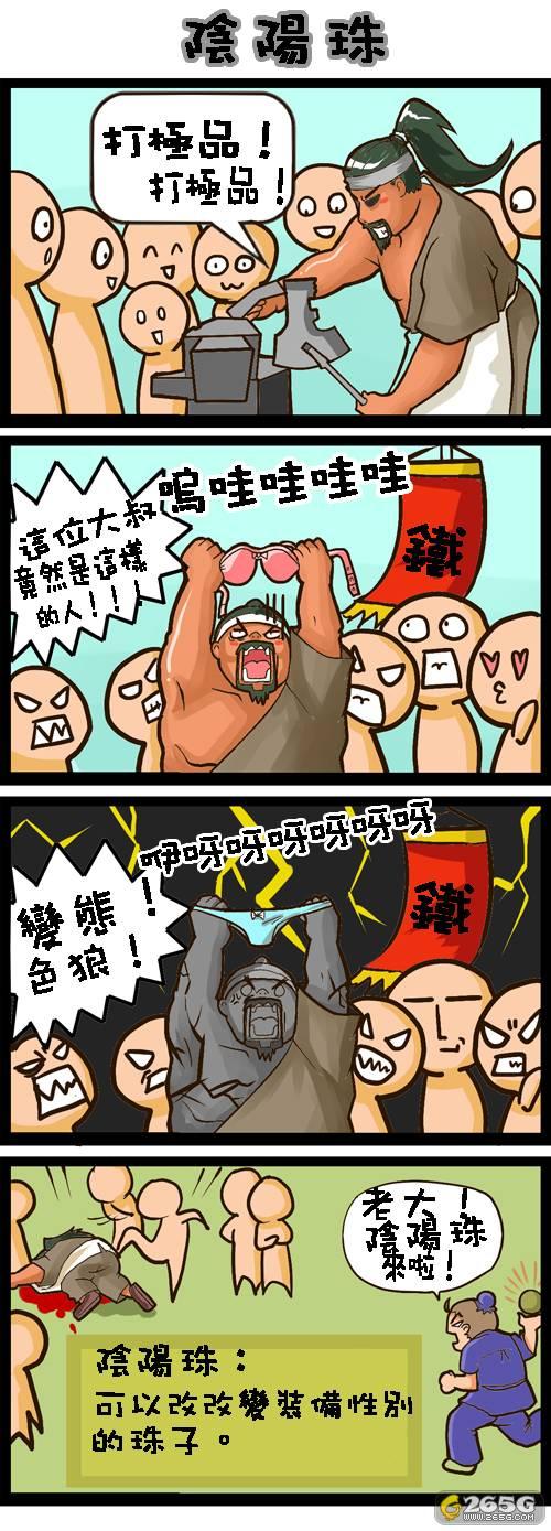 某日,自诩为妖姬无双第一工匠的某大叔男要向所有人当场展示其锻造极品装备之手法,经过千锤百炼之后终于在一片瞩目中从炉中拿出一个女生内衣,于是观望众人愕然,有女子低声道:“没想到这大叔竟然是这种人!”大叔巨汗,于是费劲心机,几乎以平生之力气奋力打造,意图以一极品装备逆转眼前之窘境,锤影翻飞之后,炉中所出竟是一可爱的粉红色女子内裤,于是全场哗然,“变态色狼”之声不绝于耳,正在此时,大叔男的徒弟已经飞奔而至,口中高声喊道:“师傅,能改变装备男女属性的阴阳珠买来了!”大叔立刻吐血数升不止。