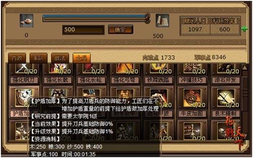 想提高军队的战斗力,光从量上着手收效并不会太高。发展科技,加强军队的战法训练才是治理的根本之道。在太学院的内政科技界面,共有几十种不同技能计谋可供学习和升级,不管在哪个时代,一个国家内政的发展是绝不能止步的。