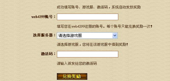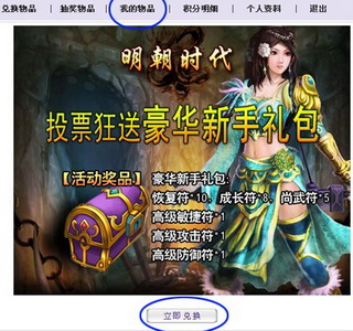 单击“立即兑换”,然后在主菜单中选择“我的物品”,很快你就可以看到礼包的激活码了。接着登录4399明朝时代官网://web.4399.com/mcsd/ 找到活动公告页面,点击“激活码兑换豪华礼包地址”进入该页面,之后的事情地球人都会操作啦。