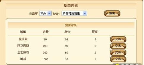 玩家在市场中选择需要的资源进行搜索,在搜索出来的货单中,选择自己想要购买的,点击交易按钮,进行交易。