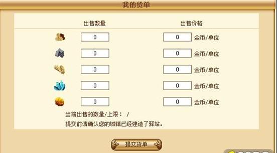 玩家可以在市场上挂单出售自己的资源,挂卖货物的数量不能超过拥有货物的上限。每种货物可设置单价的下限是1金币,上限是99金币。