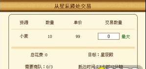 购买货物需要商队,每支商队的运输量是300单位,购买货物的量超过商队可以运输的量,则无法购买。交易成功后,玩家商队向卖方出发,商队出发状况在驿站查看。交易商队派出之后,无法撤回。商队到达卖方城市,开始装载购买的资源货物,驿站查看货物装载状况。交易商队装载货物过程中,无法取消装载。商队装载完成,返回玩家城市。商队返回状态在驿站之中查看。交易商队返回途中,无法撤回。