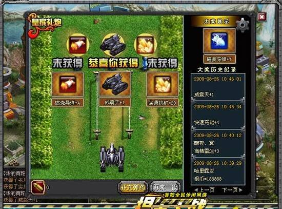 皇家礼炮因为能开出大量经验、海量银币和极品坦克威震天等而备受大家青睐。相信每次发射礼炮前大家的心都会提到嗓子眼,还有玩家沐浴焚香希望给自己带来点好运气。中间?左边?还是右边?终于下定决心,点击,发射!天啊,这不是在做梦吧,真的让我中了威震天!
