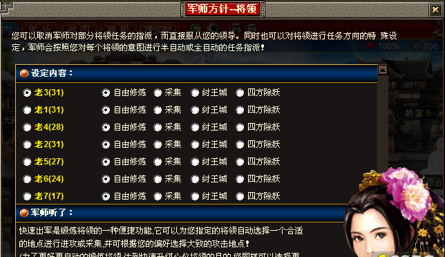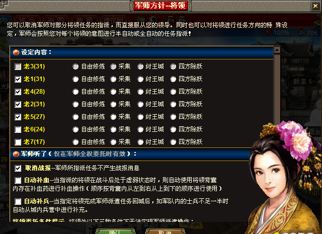 将领只能在城内才能进行指派,勾选将领后,可以选择指派的类型,除妖、采集、攻打纣王城均可以。如果你选择是"全权委托",你还可以选择"取消战报","自动补血","自动补兵"。当设定好以后,点击"确认"就会进入扣费界面,扣费成功后即可。