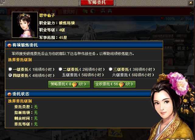 "军师委托"是个付费服务,有两种可以选择,一个是"策略委托",一个是"全权委托";选择"一级委托"----"六级委托"主要根据你最高将领的级别,最高将领等级小于10级只能选择"一级委托",最高将领等级大于等于10级小于20级就可以选择二级委托了,以此类推,当最高将领30级就可以选择四级委托了,那么就可以同时指派4名将领由军师自动来练级。1将领/6小时"策略委托"收费2玛瑙贝,全权委托收费14玛瑙贝,每多一个将领收费翻倍,界面如下: