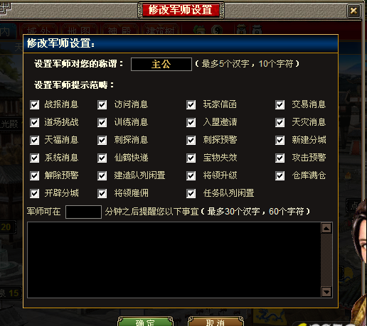 "军师设置",就是军师提示消息的类型,默认是全部勾选的。这些提示尤其适合刚开始玩策略战争的小白,因为小白经常会在这些事情上犯错误。还可以设置军师对自己的称谓,这个有点YY了,默认是"主公",我们单位同事就有设成"老公",BT啊。最下面有一个事件提醒,就是设定个时间,这个时间后,军师就会冒泡泡提示里面的内容,内容是自己事先写好的一段话。