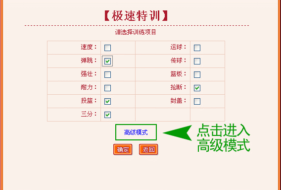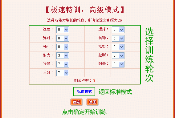 3、这里是“高级模式”页面,您可以自由选择训练项目以及每个项目需要训练的轮次(总数必须为26轮),选择完毕后,点击“确定”开始训练;(图3)