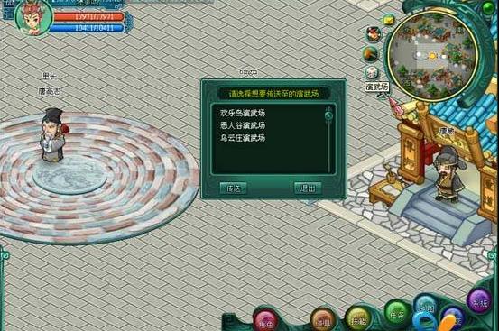 通过点击游戏界面右上方微型地图旁的演武场快捷按钮可以打开演武场选择界面,目前游戏中设置了欢乐岛演武场、恶人谷演武场、乌云庄演武场,选择任意一个演武场,系统就会将你传送到该演武场地图中。