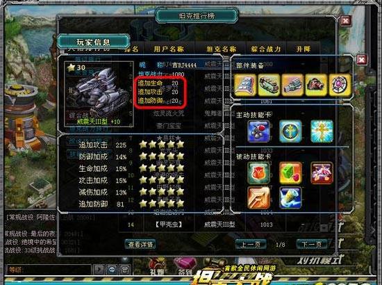 装备在坦克上的技能卡效果和技能卡相关数值决定了技能战斗力,战斗力的数值越高,排名就越靠前。在这里排名靠前的话,可以得到追加生命、追加攻击、追加防御三种属性加成。第一名每条都能加20点。