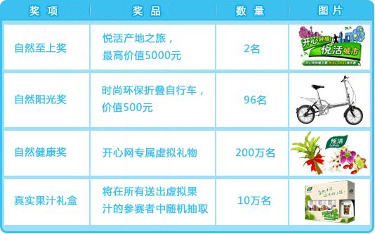 -从获奖城市的参赛者中抽取5名幸运用户,参加悦活绿色家园公益项目,见证爱心事业,体验悦活绿色环保公益之旅。