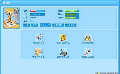 《大富豪》商场竞争除了几种手段之外,还有一招最厉害的杀手锏,最能够出其不意给与对方沉重打击的商业策略谋术。《大富豪》中一共有制造裁员流言、扮演刁蛮顾客、举报安全隐患、贿赂对方员工、破坏交通工具、引诱员工喝酒六种策略可供玩家任意对竞争对手使用。每种策略都会给对手的员工造成员工忠诚度、士气、人品等属性值下降,最终造成对手商业经济收入的降低。