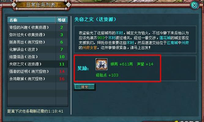 日常任务绝对是不能忽略的。完成日常任务,不但有丰厚的银两、经验奖励,在声望提升方面也绝对是毫不吝啬。每日十五个日常任务,声望提升不下于两百。利用有限的日常任务次数,最大化的提升声望,也是需要有诀窍的。