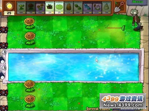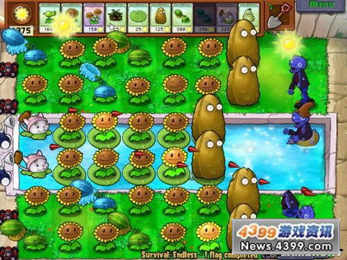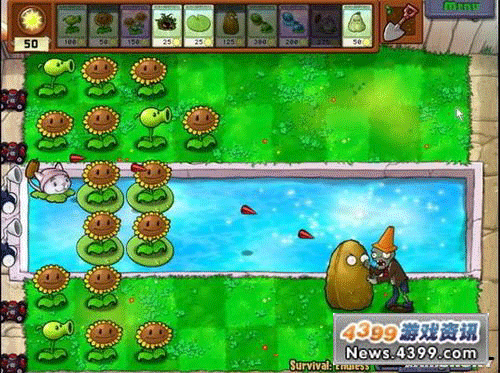 8炮流的威力不需要解释了吧,有人已经凭借8炮阵型打到生存200+了。在这里主要是向新手演示一下初期阵型的发展。基本的思路是前期尽量种花,尽可能不要造多余的植物。你不一定要像这样发展,但至少应该在15关以前成型。这次我在第9关成型,算是比较快了。但即使稍慢,用这种方法12关时也应该可以成型了。
