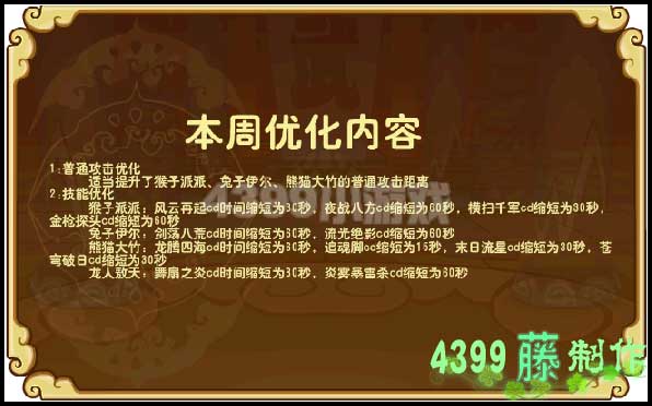 猴子派派:风云再起cd时间缩短为30秒,夜战八方cd缩短为60秒,横扫千军cd缩短为30秒,金枪探头cd缩短为60秒