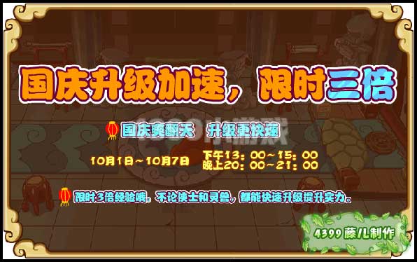 十一长假爽翻天,升级更快速,10月1日~10月7日每天下午13:00~15:00,晚上20:00~21:00限时3倍经验哦。不论侠士和灵兽,都能快速升级提升实力。