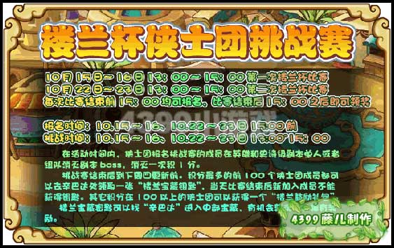 挑战赛结束后到下周四更新前。积分最多的前100个侠士团成员都可以去辛巴达处领取一张“楼兰宝藏钥匙”,当天比赛结束后新加入成员不能获得钥匙。其它积分在100以上的侠士团可以获得一个“楼兰鼓励礼包”。