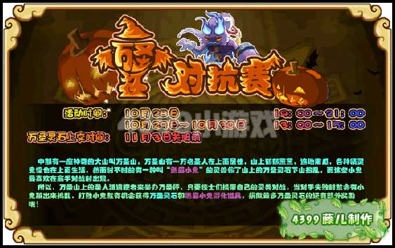中部有一座神奇的大山叫万圣山,万圣山有一万名圣人在上面居住,山上郁郁葱葱,遍地南瓜,各种精灵鬼怪也在上面生活,然而时不时的有一种叫“燃眉小鬼”的灵兽偷了山上的万圣灵石下山捣乱,而这些小鬼最喜欢在高手对战时出现。