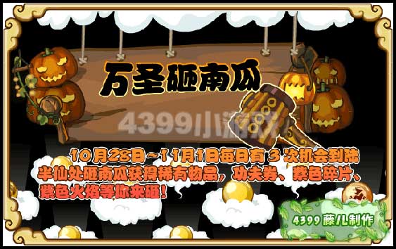 10月28日~11月1日每日有3次机会到陆半仙处砸南瓜获得稀有物品,功夫券、紫色碎片、紫色火焰等你来砸!