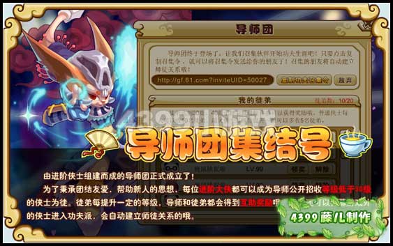 为了秉承团结友爱,帮助新人的思想,每位进阶大侠都可以成为导师公开招收等级低于30级的侠士为徒。