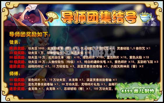 功夫豆5000、起死回生草(赠)×5、个人经验1.5倍符×1、灵兽经验1.5倍符×1