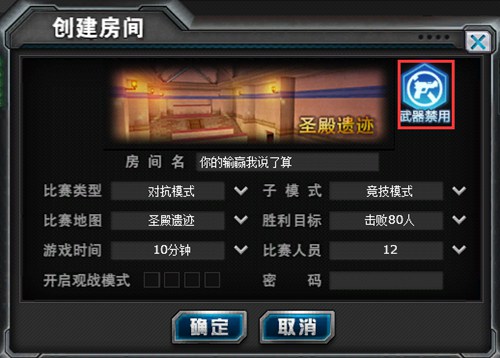 【适用范围】:自由区房主创建房间时,当比赛类型时对抗模式或生化变异时,会出现武器禁用按钮。