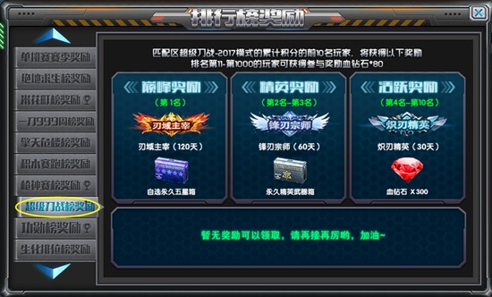 第一期超级刀战排行榜结束时间:11月25日9:30,活动结束后第三日(周四)0时,排名前1000名的玩家可前往排行榜领奖区领取专属奖励。