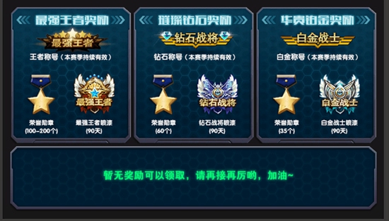 第三十三赛季奖项分为:“最强王者奖励”、“璀璨钻石奖励”、“华贵白金奖励”。根据大家之前获得的段位积分,只要达到以下段位,即可获得相应的奖励。