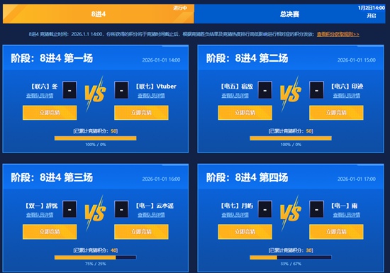 8进4阶段:1月1日14:00~18:00,每场比赛赛事时长约1小时