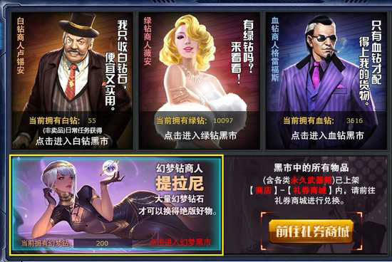 主界面“黑市”按钮,界面的最下方即可找到幻梦钻商人提拉尼。