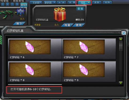 答:通过“仓库”-“道具”开启【幻梦碎钻石礼盒】后,可随机获得6~10个幻梦碎钻。