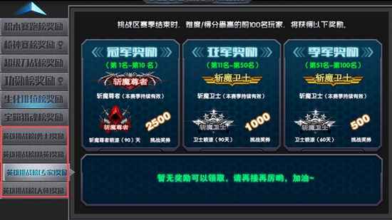 挑战区赛季结束时,难度得分最高的前100名佼佼者,可获得排行奖励。