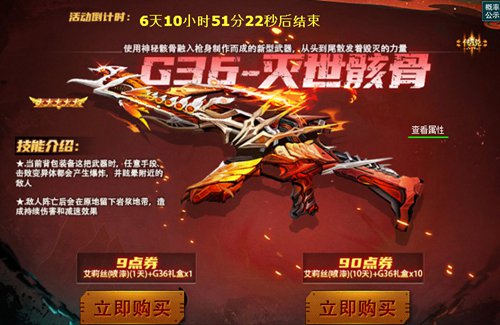 【礼盒内容】打开礼盒可获得G36-灭世骸骨(1天/3天/7天/30天/永久)或者弹匣/钻石/道具卡等。每次打开礼盒都能增加幸运值,幸运值满时立刻获得G36-灭世骸骨。