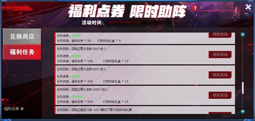 ④部分任务每日0点刷新,刷新时会清除未领取的福利点券。任务请在完成当日的0点前及时领取奖励