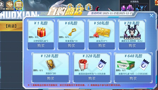 【活动内容】在界面点击即可以对应的价格获得指定道具: