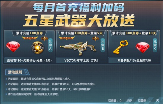 礼盒A领取条件:每月充值额度,首次达到100点券即可领取。