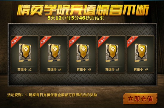 【活动细则】活动期间内充值天数达到条件后即可到主界面领取奖励。充值天数累计5天最多可获得英雄令*27。