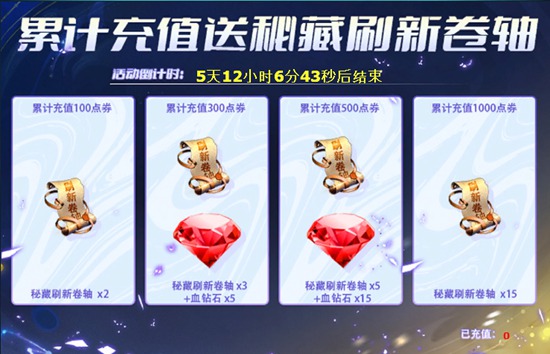 累计充值300点券,可得刷新卷轴*3,血钻石*5;