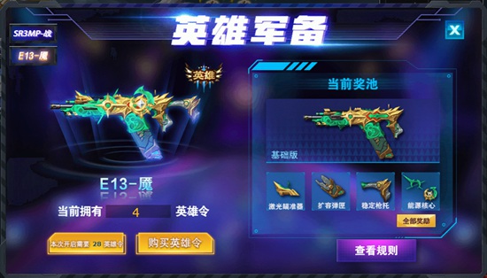 【活动细则】使用英雄令在英雄军备里开启军备,获得配件后可以为E13-魇组装配件。