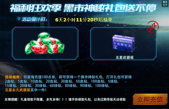 ①活动期间充值100点券,即可获得1个黑市神秘礼包。