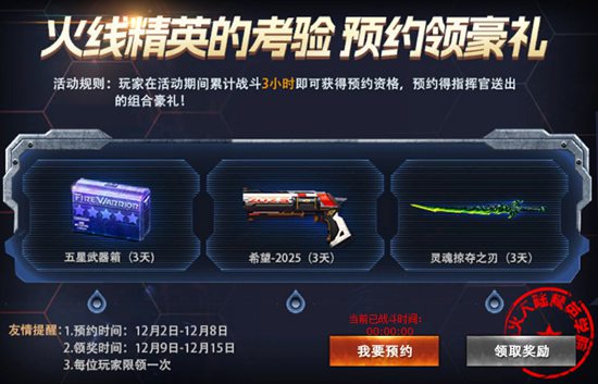 【活动细则】凡是在12月2日~12月8日期间战斗累计3小时点击“我要预约”的玩家即可于12月9日~12月15日期间领取豪礼。