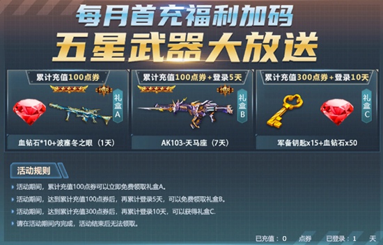 礼盒A领取条件:每月充值额度,首次达到100点券即可领取。