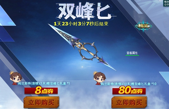 【活动细则】活动期间精彩活动界面可以8点券购买兰斯特表情(1天)送双峰匕礼盒*1,80点券可购买兰斯特表情(10天)送双峰匕礼盒*10